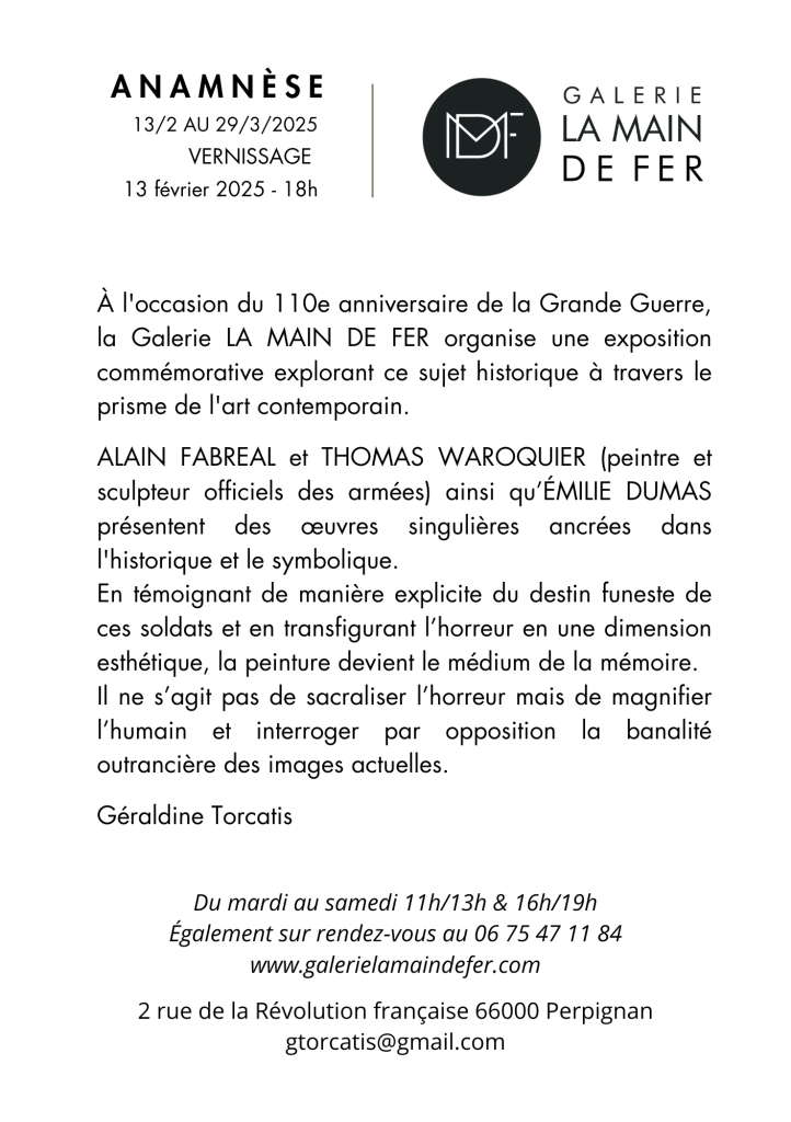 - Anamnèse, La grande guerre, 1914-1918, du 13 février au 29 mars 2025, Galerie de la Main de fer, 2 rue de la Révolution française à Perpignan